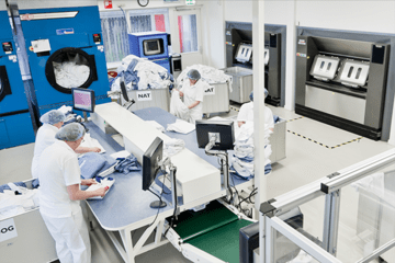 Net als bij onze industriële wasprocessen, is bij de high care de vervuilingsgraad een belangrijke bepaler. Omdat slachthuiskleding besmeurd kan zijn met bloed, krijgt deze kleding een zwaarder wasprogramma dan bakkerskleding. Henk legt uit: “Vervuilde kleding wordt eerst voorgewassen op 30 graden, om te voorkomen dat het vuil in de kleding brandt. Pas daarna volgt het complete wasprogramma met hogere temperaturen, zoals 70 graden.”