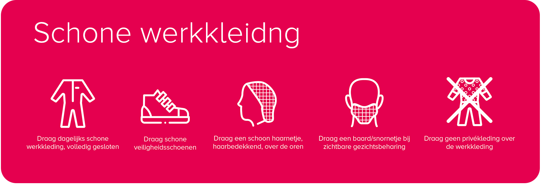 Er zijn nog tal van andere aandachtspunten om te garanderen dat medewerkers hygiënisch werken. Bijvoorbeeld dat eten, drinken, roken en het gebruik van medicijnen niet zijn toegestaan in de productieruimte. Heeft iemand een voedselinfectie, ernstige verkoudheid, loopneus, buikgriep of andere besmettelijke ziekte? Laat het diegene melden aan zijn of haar leidinggevende. Het reinigen van de werkplek en spullen na werktijd is een ander aandachtspunt, evenals het dicht houden van deuren om ongedierte en ongewenste luchtstromen te voorkomen.