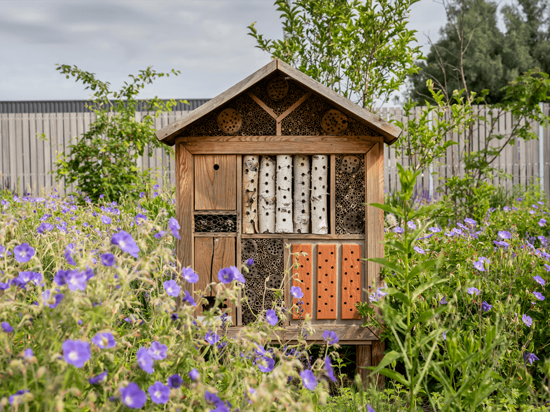 - Biodiversiteitstuin met insectenhotels en nestkasten voor het behoudt van schaarse en zeldzame diersoorten uit Flora en Fauna wet.