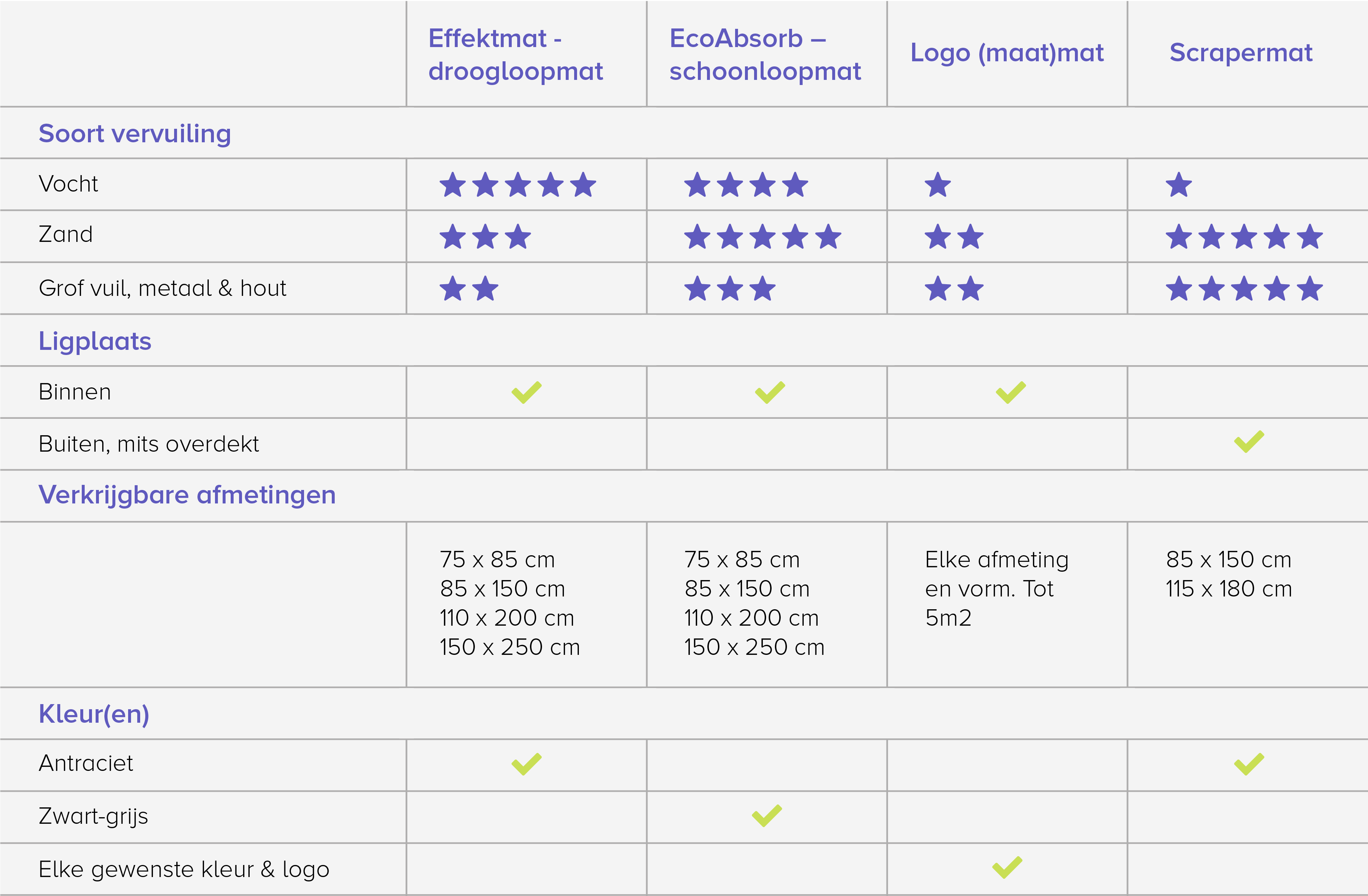 Ontdek onze huurservice: matten voor bedrijven. Wij bieden een ruime keuze aan schoonloopmatten, droogloopmatten en logomatten.