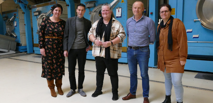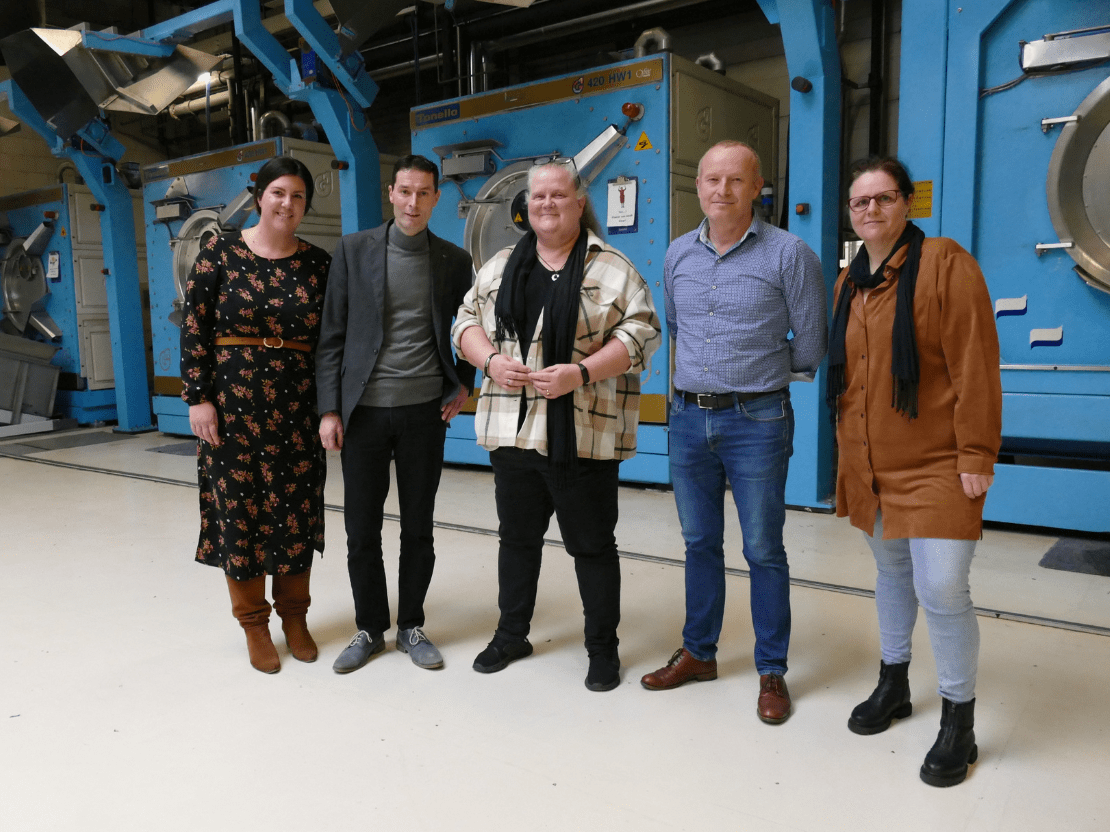 Op de foto van links naar rechts: Amanda, Patrick (leden OR van Lavans), Yolanda, Dino (FNV Textielverzorging) en Nathasja (lid OR van Lavans).