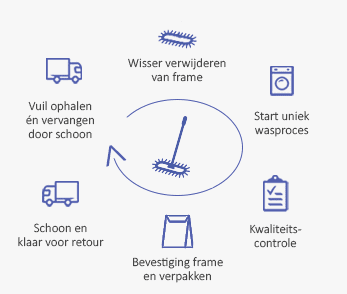 Heel simpel: jij gebruikt de wissers, wij doen de rest. We leveren schoon, halen vuil op, wassen ze en brengen een frisse set mee. Zo heb je altijd een schone wisser binnen handbereik. Wel zo makkelijk.