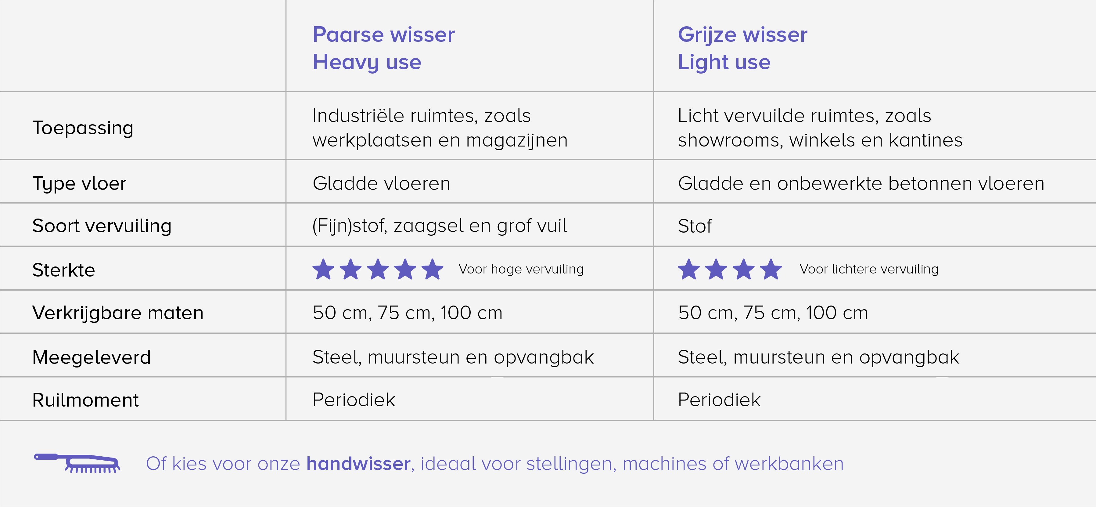 We hebben zowel hand- als vloerwissers, geschikt voor elke ruimte en mate van vervuiling. Of het nu gaat om een industriële ruimte of een showroom, Lavans heeft de juiste oplossing in huis. Afhankelijk van de omgeving en vervuiling kies je de juiste Lavanswisser. Hieronder zie je in één oogopslag welk type het beste aansluit bij jouw situatie.